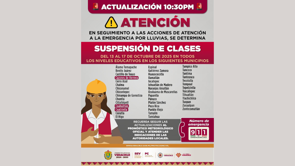 El Comité Estatal de Emergencias, en coordinación con la Secretaría de Educación, determinó la suspensión de clases en 41 municipios, del 13 al 17 del presente mes, con el objetivo de garantizar la seguridad de estudiantes, docentes y personal escolar: