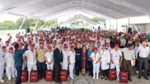 Acompañaron a la Presidenta de México, el secretario técnico de la Presidencia de la República y director general de Programas para el Bienestar, Carlos Torres Rosas; la subsecretaria de Egresos, Bertha Gómez Castro; y la facilitadora de la salud, Esthela Guzmán Cruz, quien realizó una breve explicación de los insumos médicos que contiene el maletín que se otorgó a las enfermeras, enfermeros, médicas y médicos del programa.