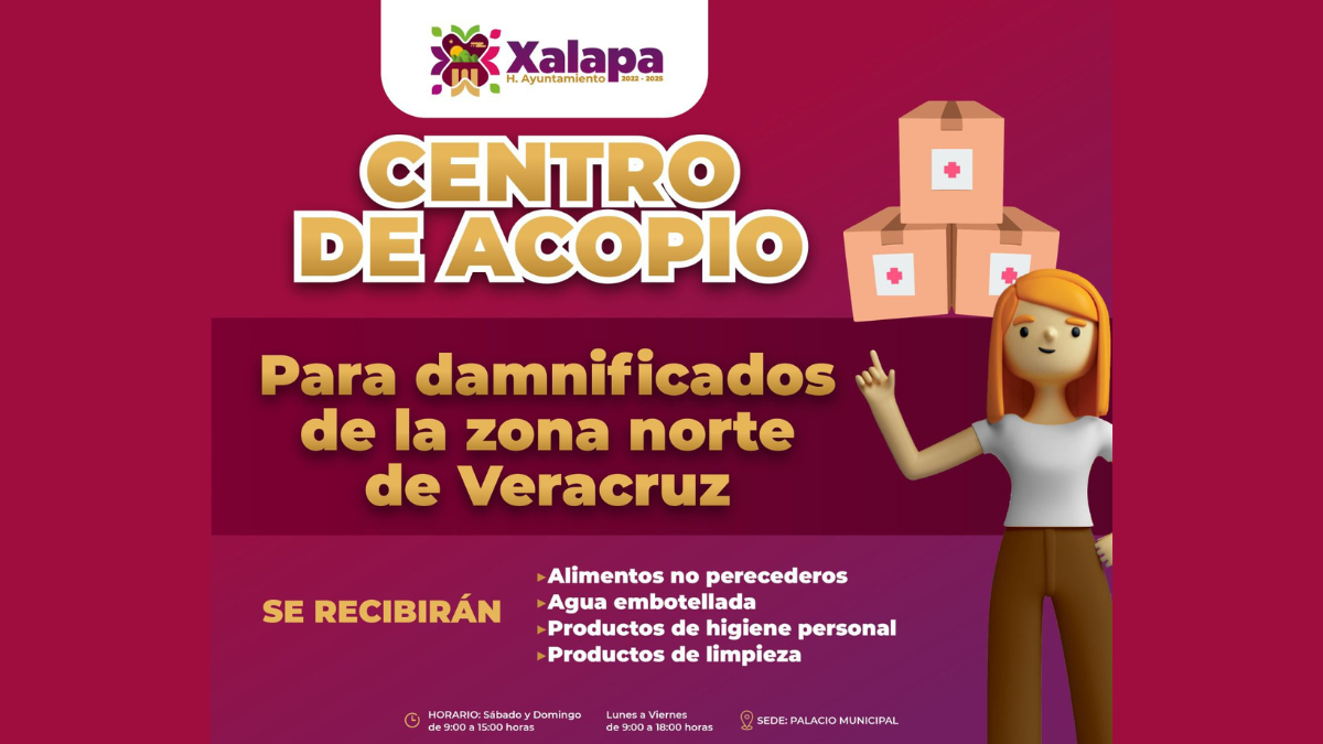 El Ayuntamiento de Xalapa invita a la ciudadanía y a todos los sectores sociales y productivos de la ciudad a solidarizarse con las familias de la zona norte de Veracruz que resultaron afectadas por las lluvias, donando alimentos no perecederos, artículos de limpieza y de aseo personal en el Centro de Acopio que se instalará a partir de este sábado en el patio central de Palacio Municipal.