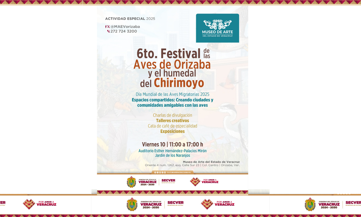 La Secretaría de Cultura de Veracruz invita a las actividades del Sexto festival de Aves de Orizaba y el Humedal del Chirimoyo que se realizarán en el Museo de Arte del Estado de Veracruz (MAEV) este viernes, en horario de 11:00 a 17:00 horas. La entrada es gratuita.