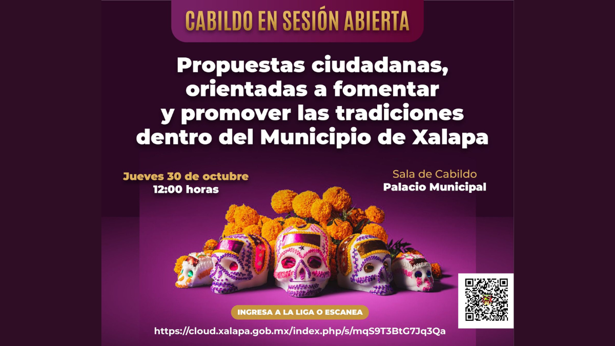 Con el propósito de recibir, escuchar y analizar propuestas ciudadanas orientadas a fomentar y promover las tradiciones en el municipio de Xalapa, el próximo jueves 30 de octubre, a las 12:00 horas, se realizará el quinto Cabildo en Sesión Abierta del año, por lo que se invita a la ciudadanía a participar y presentar sus iniciativas en la materia.