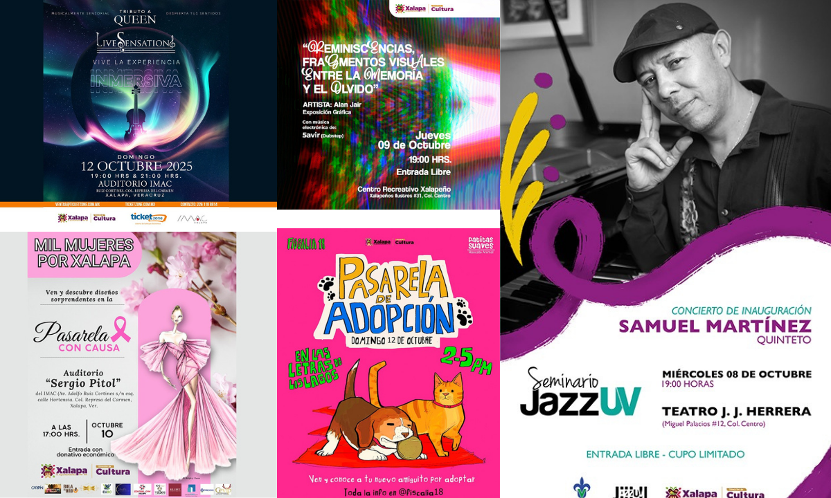 El miércoles, a las 17:00 horas, en el Museo Casa de Xalapa (Muxa), se desarrollará la charla “Construyendo tu imagen interior”. En el Centro Recreativo Xalapeño (CRX) se inaugurará la exposición multidisciplinaria de Jesús Saí, “En busca de…”, a las 18:00 horas. A las 19:00 horas, en el Teatro J. J. Herrera, se tendrá el concierto de inauguración de Samuel Martínez, del Seminario JazzUV.