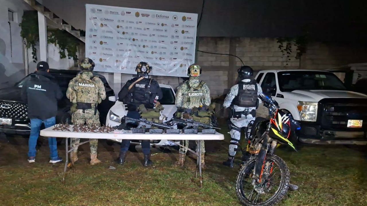 En apoyo a la Fiscalía General del Estado, durante cateos en Papantla, Huayacocotla, Tihuatlán, Veracruz, Altotonga, Tezonapa, Oluta y Minatitlán, fueron aprehendidas cuatro personas, asegurándose 20 dosis y una bolsita de una sustancia con características del cristal, así como 24 dosis, una bolsita y un cigarro de hierba seca similar a la marihuana; cinco armas de fuego largas y una réplica, cargadores, cartuchos útiles, armas blancas y dinero en efectivo.
