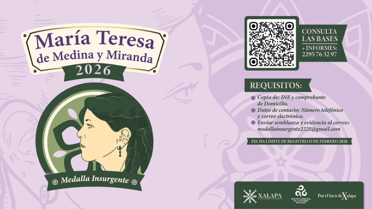 Con el fin de reconocer la trayectoria y trabajo en favor de la igualdad de género, la promoción y la defensa de los derechos de las mujeres, el Ayuntamiento, a través del Instituto Municipal de las Mujeres de Xalapa (IMMX), invita a la ciudadanía a participar en la convocatoria de la medalla insurgente “María Teresa de Medina y Miranda 2026”.