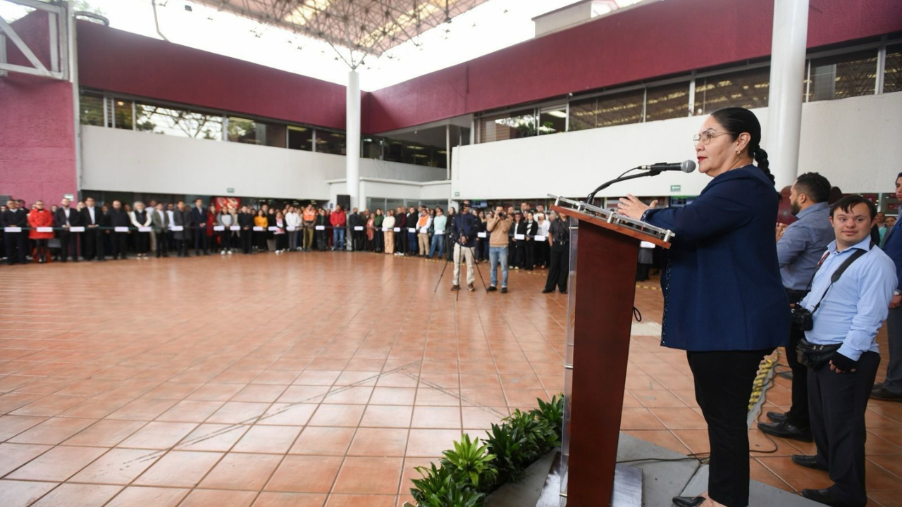 Al encabezar la ceremonia de Lunes Cívico en la explanada de las oficinas centrales de la dependencia, la titular de la SEV, Claudia Tello Espinosa, informó que estos avances corresponden al programa Transformando la Educación.