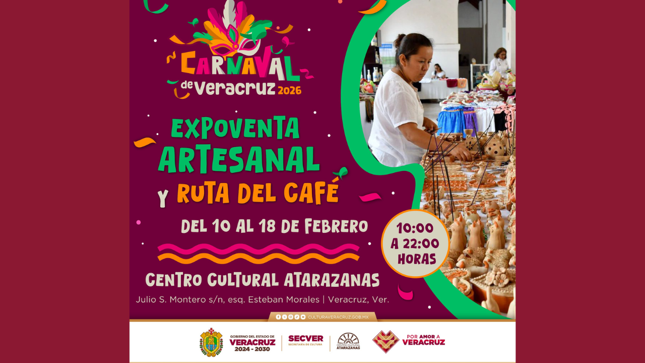La Secretaría de Cultura de Veracruz (SECVER) invita a la Expoventa Artesanal y Ruta del Café en el Centro Cultural Atarazanas, con motivo del Carnaval de Veracruz, a partir de mañana 10 y hasta el miércoles 18 de febrero. La entrada es gratuita.