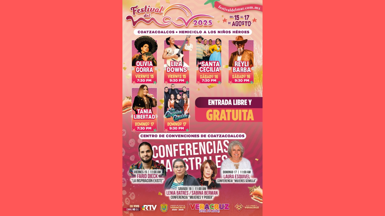 Con un variado programa que incluye música, danza, literatura, talleres, conferencias magistrales y exposiciones de artes visuales, el Gobierno del Estado reitera la invitación a disfrutar del Festival del Mar en Coatzacoalcos, que se llevará a cabo del 15 al 17 de agosto en la Casa de la Cultura y en el Centro de Convenciones de Coatzacoalcos, con entrada gratuita.