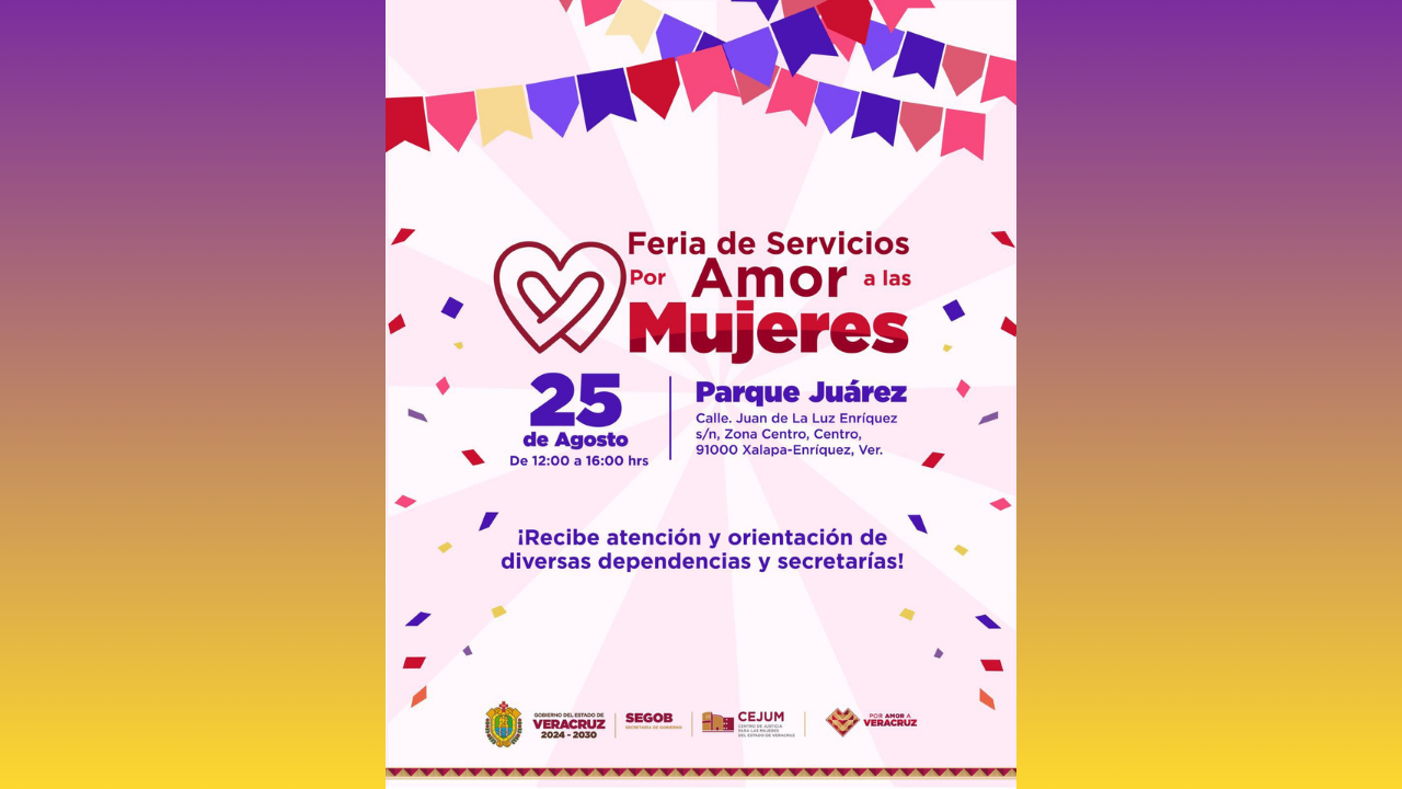 El Gobierno del Estado ofrecerá servicios gratuitos integrales en la Feria de Servicios Por Amor a las Mujeres, este lunes 25 en el parque Benito Juárez, a la que invita el Centro de Justicia para las Mujeres del Estado de Veracruz (CEJUM).