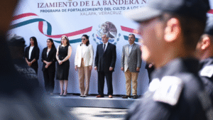 Acompañado por autoridades municipales y estatales, el Alcalde participó en este acto, con el fin de fortalecer los valores cívicos y el respeto a los símbolos patrios.