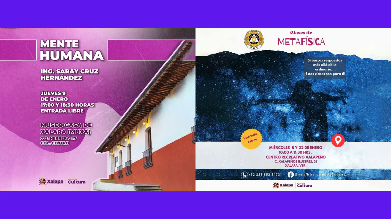 Este lunes 6 de enero, a las 18:00 horas, en el Barrio Mágico de Xallitic, se presentará el ensamble XalArpa. Habrá sorpresas, envueltos y ponche. El martes 7 de enero, a las 17:00 y 18:30 horas, en el Museo Casa de Xalapa (Muxa), Saray Cruz Hernández ofrecerá la charla “Ley de atracción”.
