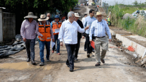 En la colonia El Olmo, el Presidente Municipal constató el avance que tiene la rehabilitación con concreto hidráulico que se realiza en la calle Del Bosque. La obra incluye trabajos de drenaje sanitario, agua potable y alumbrado público, así como escalones, guarniciones, banquetas y 2 mil 204 metros cuadrados de pavimentación.