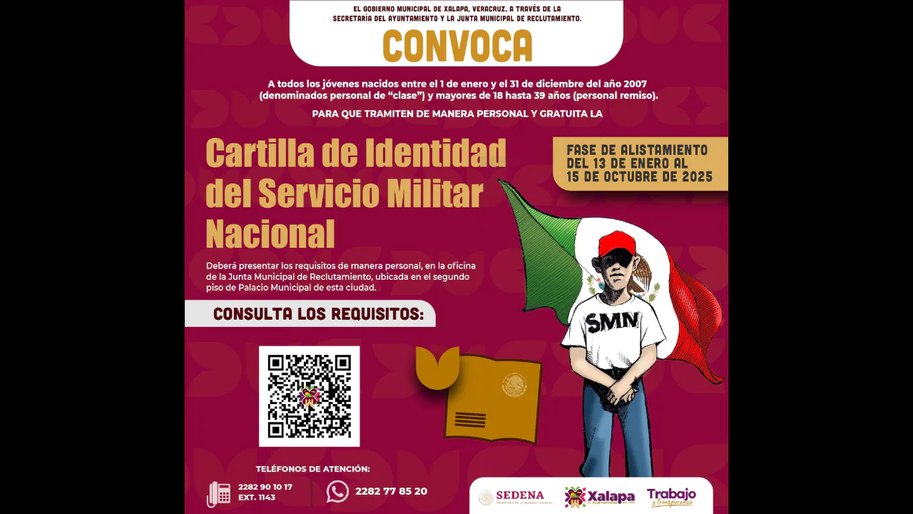 El Ayuntamiento de Xalapa, a través de la Secretaría del Ayuntamiento y la Junta Municipal de Reclutamiento, convoca a los jóvenes de la Clase 2007 y Remisos, a tramitar la Cartilla de Identidad del Servicio Militar Nacional participando en la Fase de Alistamiento, que inicia este lunes 13 de enero y concluye el 15 de octubre.