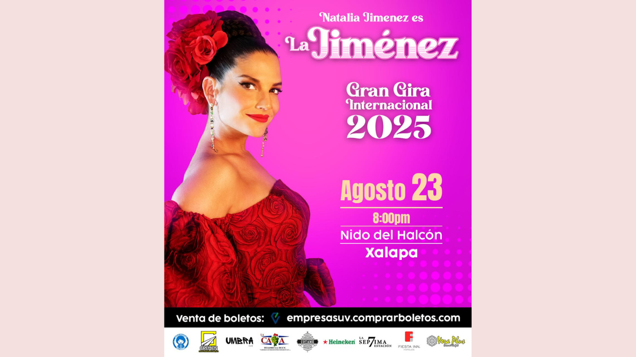 Invitan al concierto de Natalia Jiménez en su gira internacional “La Jiménez” el sábado 23 de agosto de 2025 a las 20:00 horas en el Gimnacio “Nido del Halcón”.