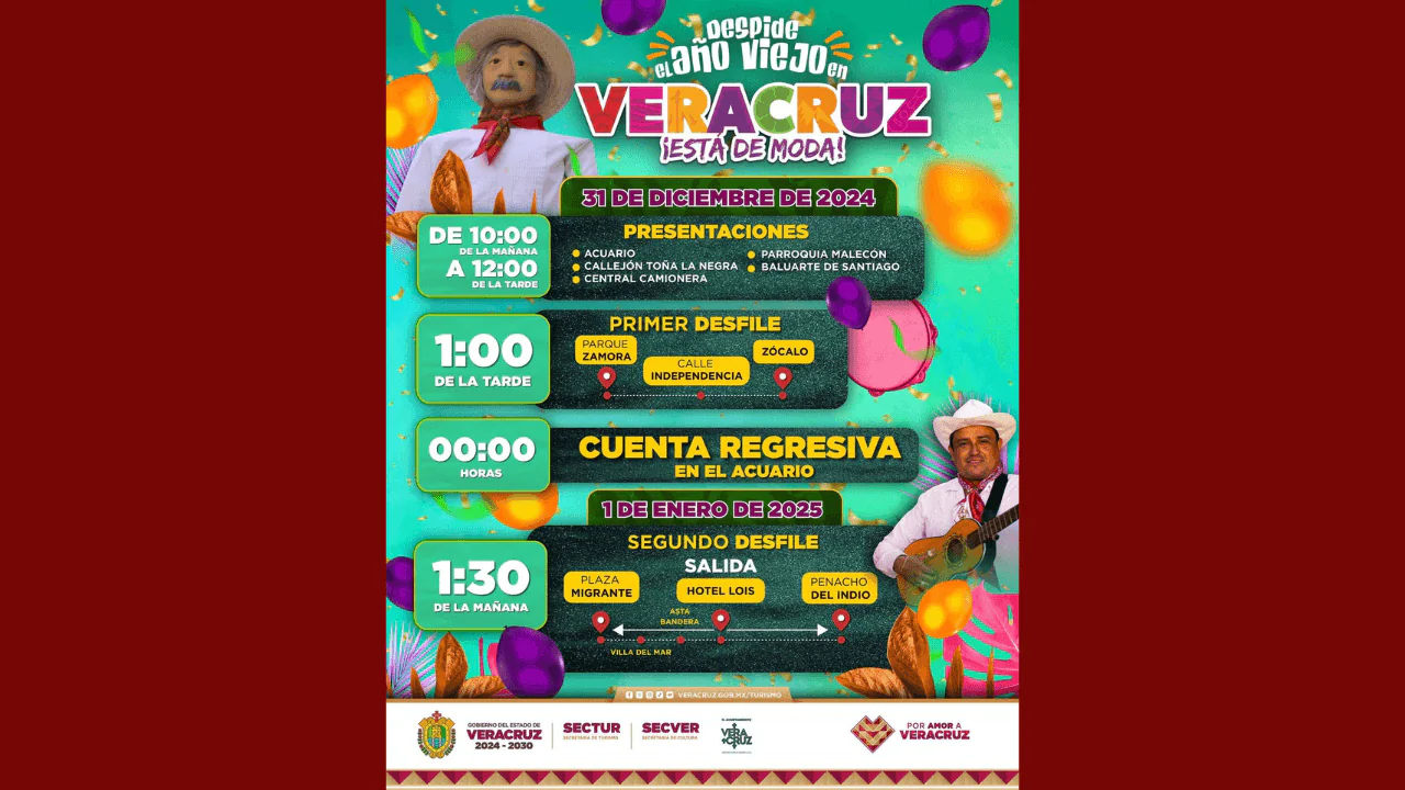 A las 13:00 horas inicia el desfile del Año Viejo, que contará con carros alegóricos, música y personajes representativos de esta tradición veracruzana. El recorrido iniciará en el parque Zamora y culminará en el Zócalo de la ciudad.