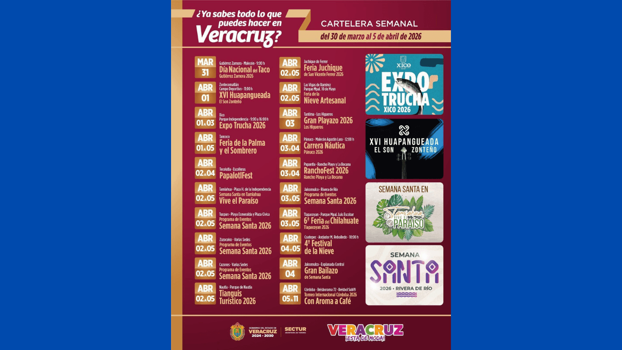 Del 02 al 05 de abril, se realizará el Tianguis Turístico 2026 en Nautla; la Feria Juchique de San Vicente Ferrer en Juchique de Ferrer, y la Feria de la Nieve Artesanal en Las Vigas. El 03 de abril, en la localidad de Los Higueros, en Tantima, el Gran Playazo 2026; el 03 y 04 de abril en Pánuco la Carrera Náutica Pánuco.