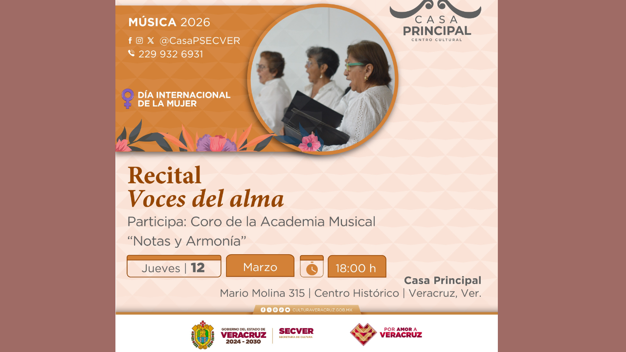 La Secretaría de Cultura de Veracruz (SECVER) invita al público en general al recital del Coro de Mujeres Voces del Alma, que se efectuará este jueves a las 18:00 horas, en el recinto cultural Casa Principal, en Veracruz, en el marco del Día Internacional de la Mujer.