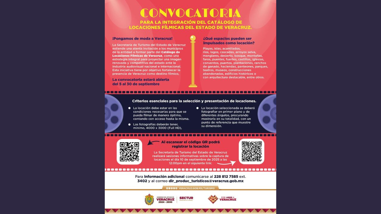 La Secretaría de Turismo (SECTUR) lanzó la convocatoria para integrar el Catálogo de Locaciones Fílmicas del Estado de Veracruz, como parte de la estrategia para proyectar una imagen renovada y competitiva de la entidad dentro de la industria audiovisual nacional e internacional.