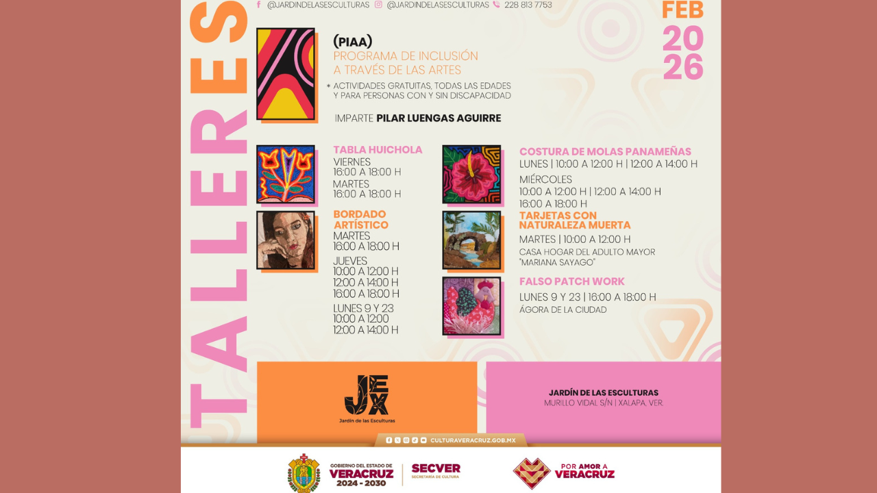 La Secretaría de Cultura de Veracruz (SECVER), mediante el Programa de Inclusión a través de las Artes (PIAA), invita al público en general a participar en los talleres inclusivos que tendrán lugar durante el presente mes en el Jardín de las Esculturas de Xalapa (JEX), cuya entrada es libre.
