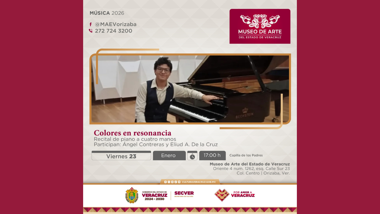 La Secretaría de Cultura de Veracruz invita al recital de piano Colores en resonancia, este viernes a las 17:00 horas, en el Museo de Arte del Estado de Veracruz (MAEV) ubicado en Orizaba. La entrada es libre.