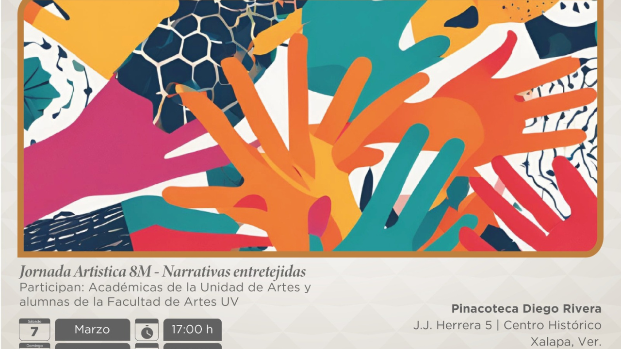 La Secretaría de Cultura de Veracruz (SECVER) en colaboración con la Unidad de Artes de la Universidad Veracruzana (UV), invita al público a la Jornada Artística 8M: Narrativas entretejidas, que se llevarán a cabo el sábado 07 y domingo 15 de marzo, a las 17:00 horas y 19:00, respectivamente, en el marco de la conmemoración del Día Internacional de la Mujer. La entrada es libre.