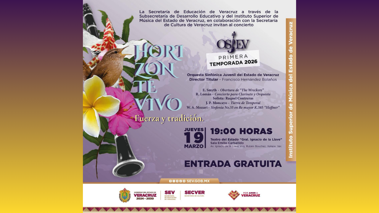 La Secretaría de Educación de Veracruz, en colaboración con la Secretaría de Cultura de Veracruz, invitan al Primer Concierto de la Temporada 2026 de la Orquesta Sinfónica Juvenil del Estado de Veracruz (OSJEV), titulado Horizonte Vivo: Fuerza y Tradición, que se realizará el próximo jueves 19 de marzo a las 19:00 horas.