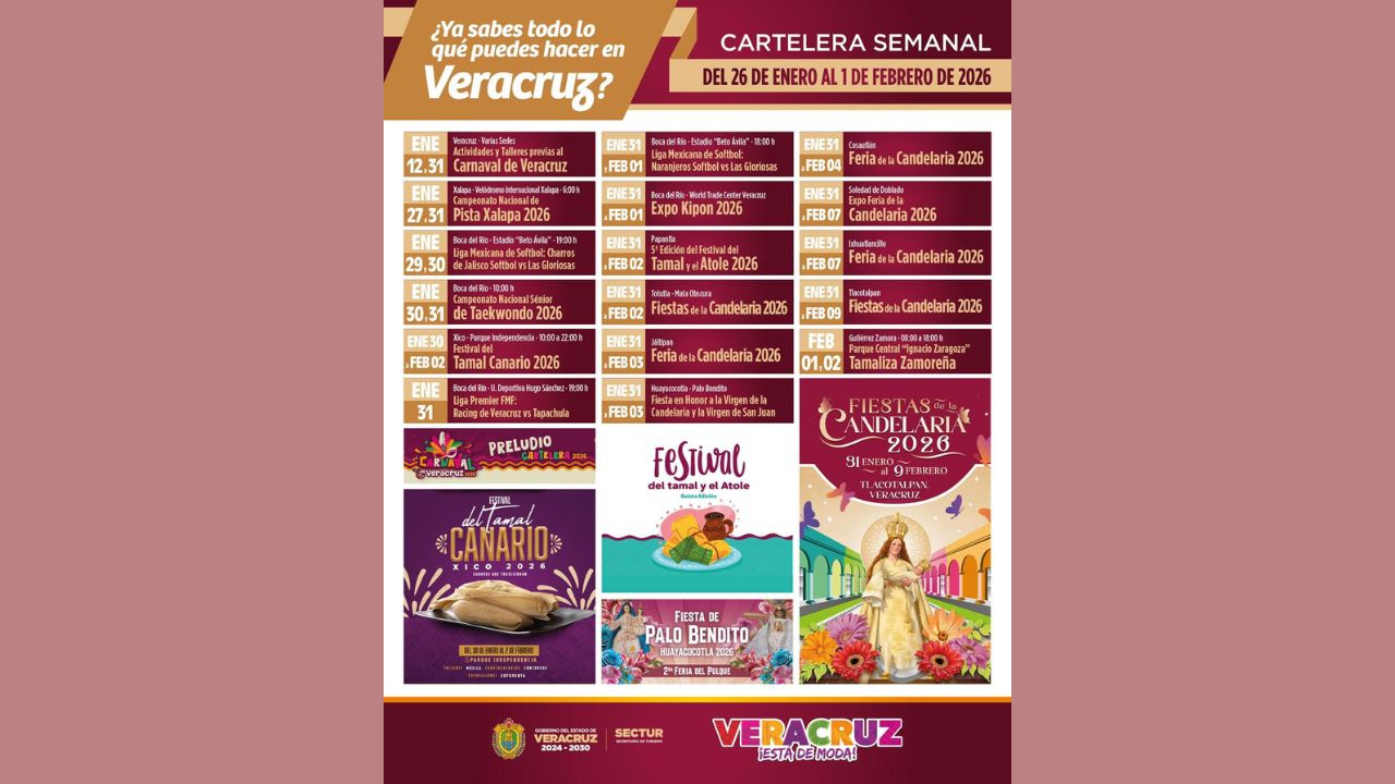 La Secretaría de Turismo (SECTUR) te invita a recorrer Veracruz y disfrutar de una amplia cartelera de actividades hasta el 01 de febrero, con experiencias que combinan tradición, gastronomía, deporte y entretenimiento.
