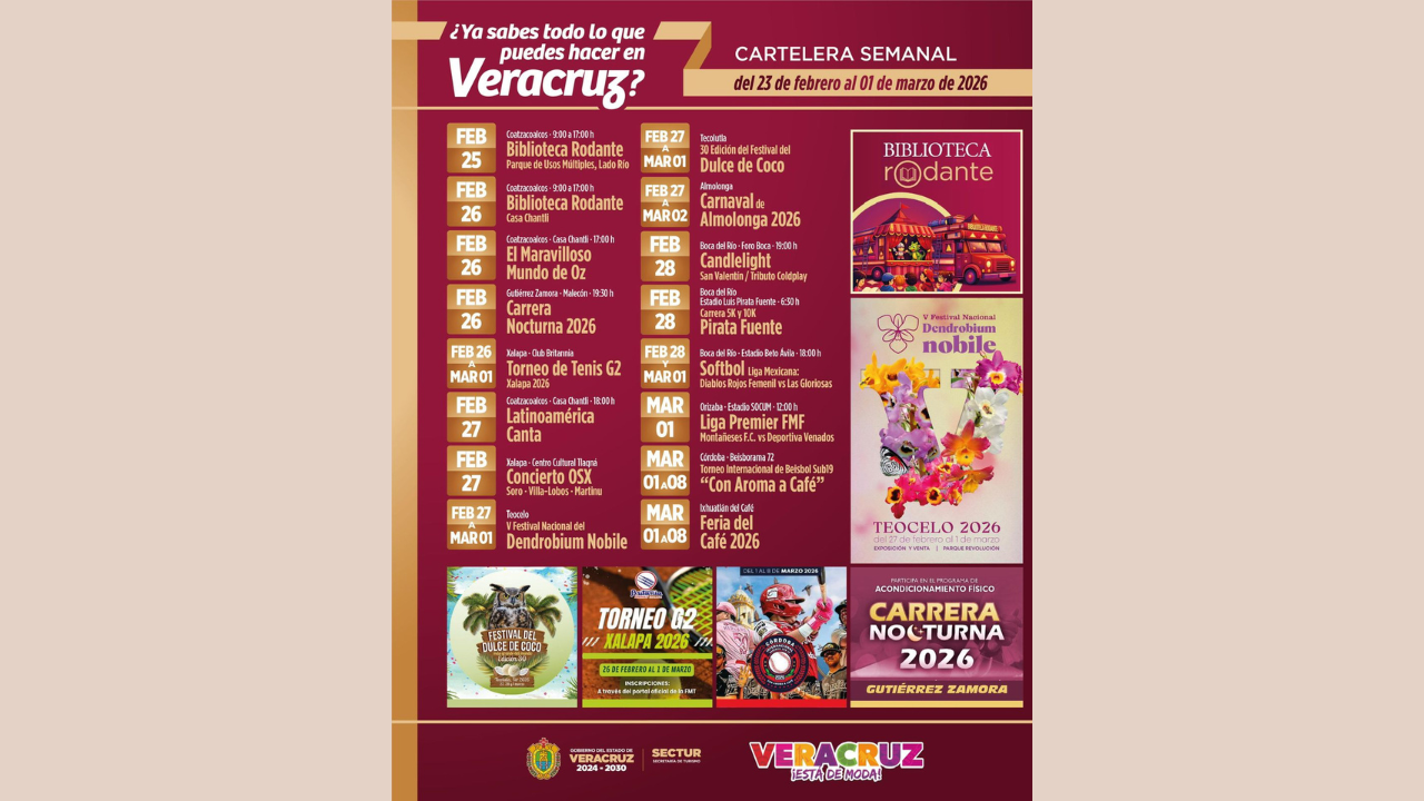 La Secretaría de Turismo (SECTUR) invita a consultar su cartelera semanal hasta el domingo 01 de marzo,  incluye eventos culturales, deportivos, gastronómicos y tradicionales, consolidando a Veracruz como un destino lleno de tradición y entretenimiento.