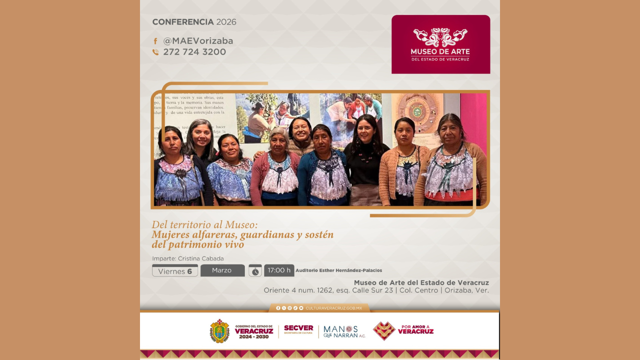 En el marco de la conmemoración del Día Internacional de la Mujer, la Secretaría de Cultura de Veracruz (SECVER) invita a la conferencia Del territorio al museo: mujeres alfareras, guardianas y sostén del patrimonio vivo, el viernes 06 de marzo a las 17:00 horas en el Museo de Arte del Estado de Veracruz (MAEV), en la ciudad de Orizaba.
