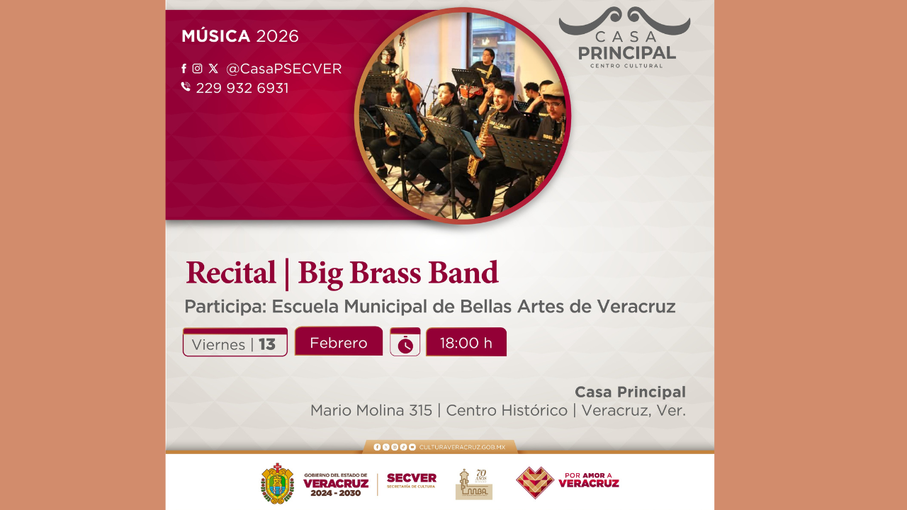 La Secretaría de Cultura de Veracruz (SECVER) invita al público a asistir al recital de la Big Brass Band, que se llevará a cabo este viernes 13 de febrero, a las 18:00 horas, como parte de la Temporada de Recitales 2026, en el Centro Cultural Casa Principal. La entrada es gratuita.