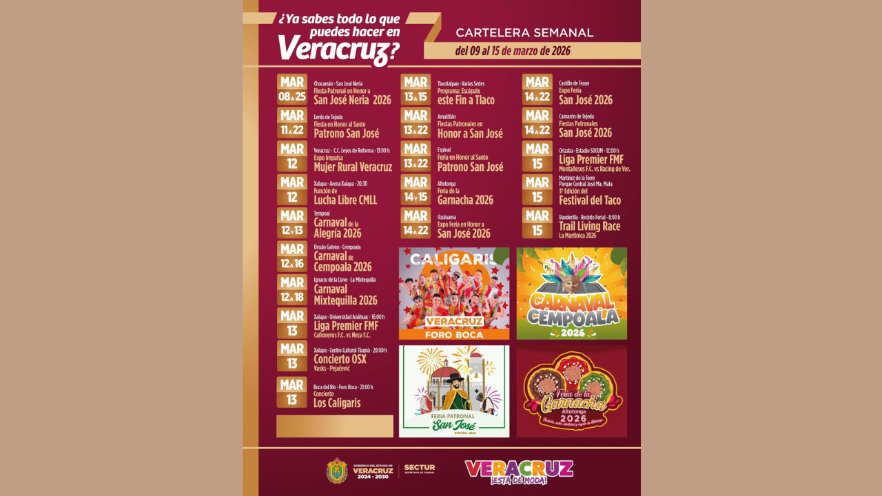 La Secretaría de Turismo (SECTUR) invita a la ciudadanía y a visitantes a disfrutar de la cartelera semanal de actividades que se realizarán en distintas regiones, con festividades patronales, carnavales, conciertos, eventos deportivos y encuentros gastronómicos que reflejan la diversidad cultural y turística de Veracruz.
